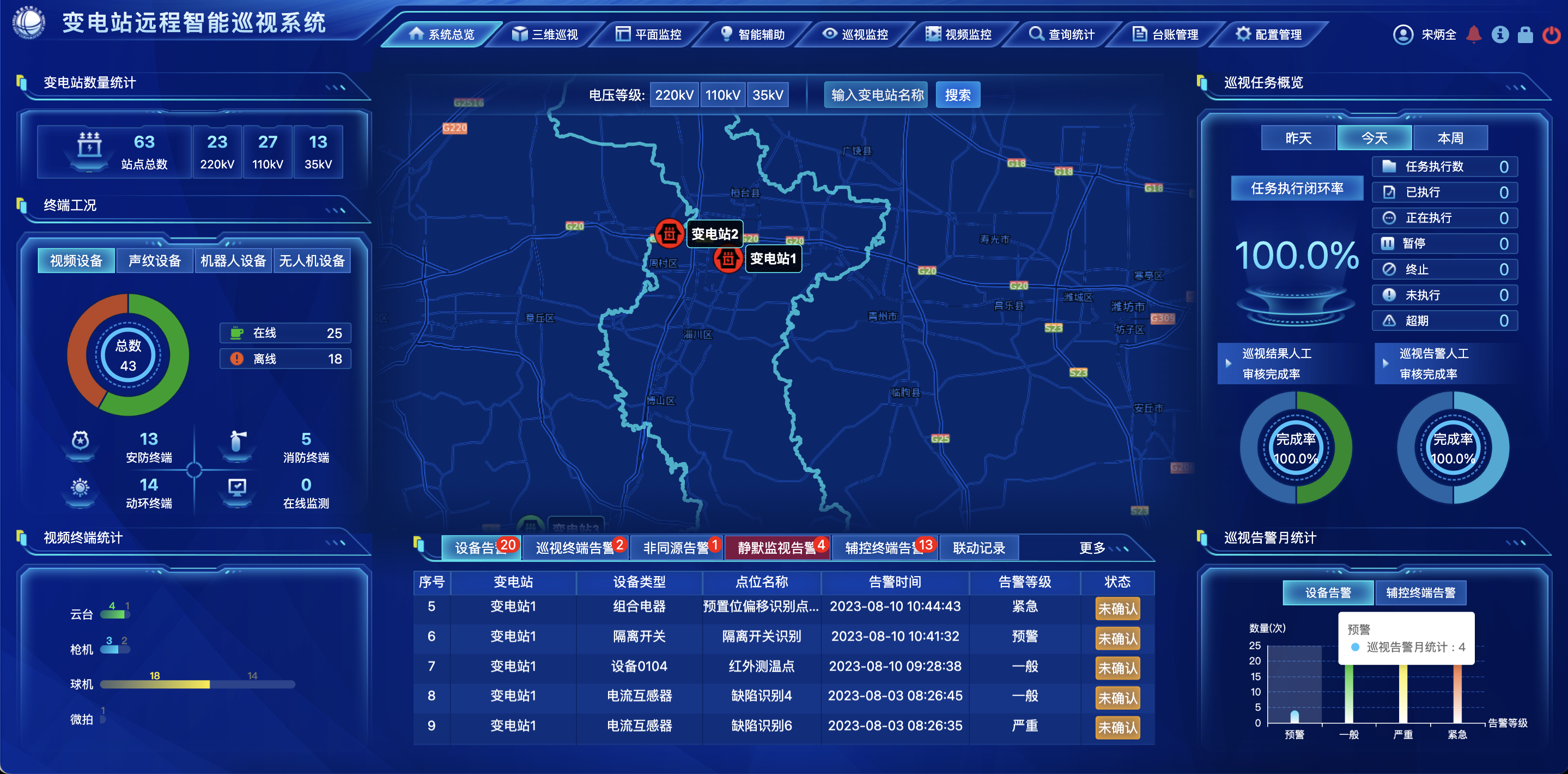 顺利获得人工智能技术的应用,实现可视化巡视图像的智能识别、自动分类、数据分析,配合自主巡视任务制定,实现例行巡视、特殊巡视、专项巡视、自定义巡视及静默监视,有效降低运维人员巡视工作量和巡视压力。